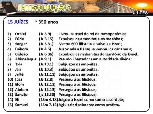 Em poucas palavras os juízes de Israel foram pessoas designadas por Deus em tempos de crise, e capacitados pelo Espírito Santo de Deus para julgar e liderar o povo.